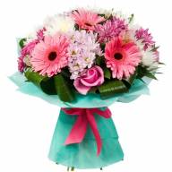 Эта нежно-розовая композиция выглядит безмерно милой и приятной. Сочетание гербер, роз и кустовых хризантем на языке цветов означает скромность, изящество, нежные чувства и при этом, благодаря хризантемам, букет универсален, способен обрадовать как возлюбленную, так и друзей или коллег, дарится в честь юбилея или другого важного праздника.
